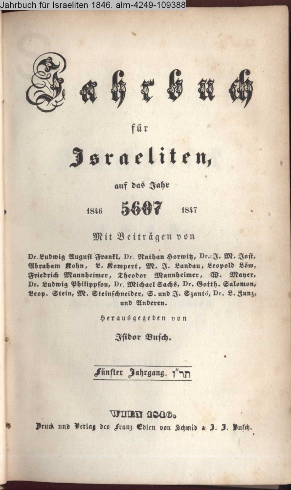 Jahrbuch / für / Israeliten, auf das Jahr / 1846 5607 1847 / Mit Beiträgen von: / Dr. Ludwig August Frankl, Dr. Nathan Horwitz, [...] Herausgegeben von / Isidor Busch. / Fünfter Jahrgang / WIEN 1846. / Druck und Verlag des Franz Edlen von Schmid & J. J. Busch
