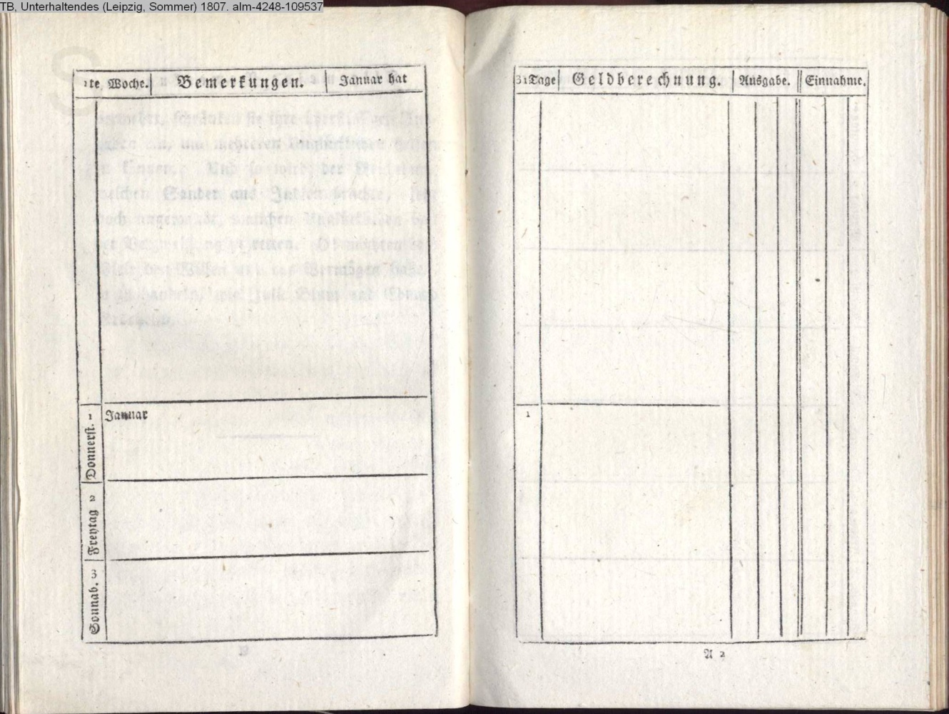 1te Woche. Bemerkungen Januar hat 31 Tage. Geldrechnung. Ausgabe. Einnahme