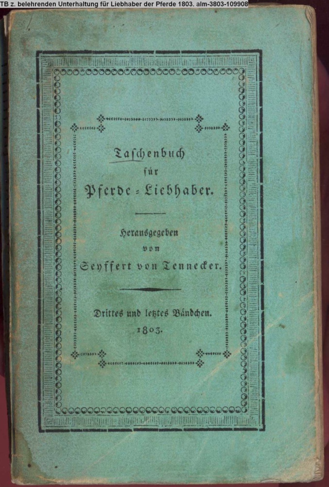 Taschenbuch / zur / belehrenden Unterhaltung / für / Liebhaber der Pferde. / Herausgegeben / von / Seyffert von Tennecker. / Drittes und letztes Bändchen. / Mit 8 Kupfern. / Dieses Taschenbuch ist eine Fortsetzung des Meß- / geschenks für Liebhaber der Pferde etc / und macht für die Besitzer desselben das sechste / und letzte Bändchen aus. / Leipzig, 1803 / bei Theodor Seeger
