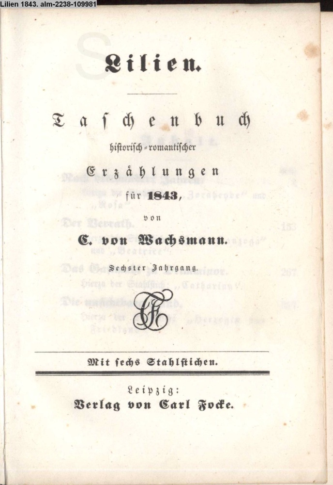 Lilien. / Taschenbuch / historisch-romantischer / Erzählungen / für 1843, / von / C. von Wachsmann. / Sechster Jahrgang. / Mit sechs Stahlstichen. / Leipzig. / Verlag von Carl Focke