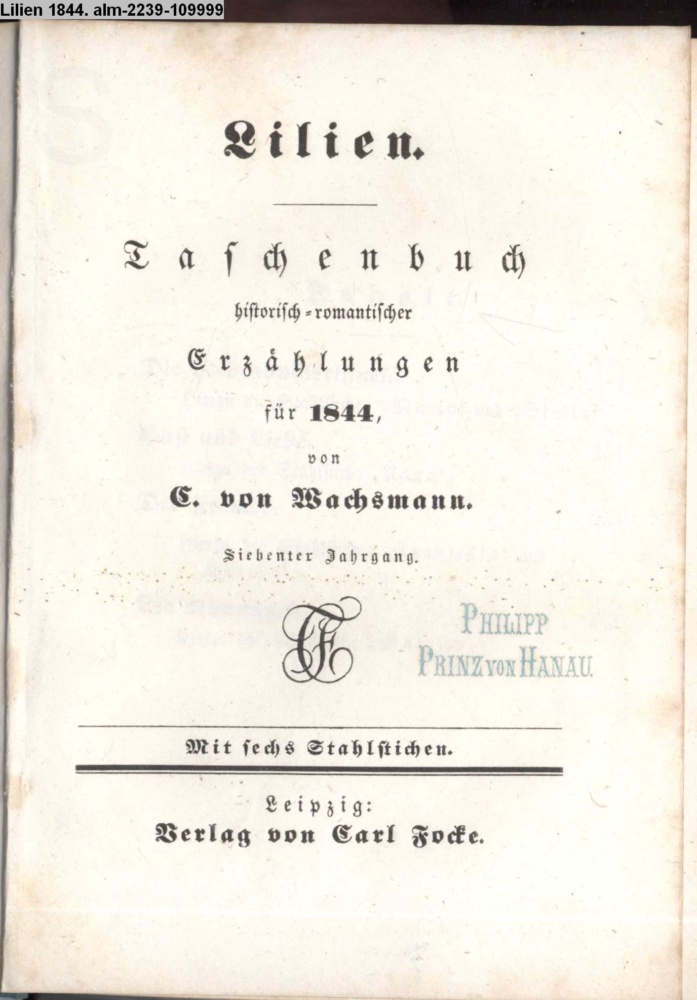 Lilien. / Taschenbuch / historisch-romantischer Erzählungen / für 1844, / von / C. von Wachsmann. / Siebenter Jahrgang. / Mit sechs Stahlstichen. / Leipzig. / Verlag von Carl Focke