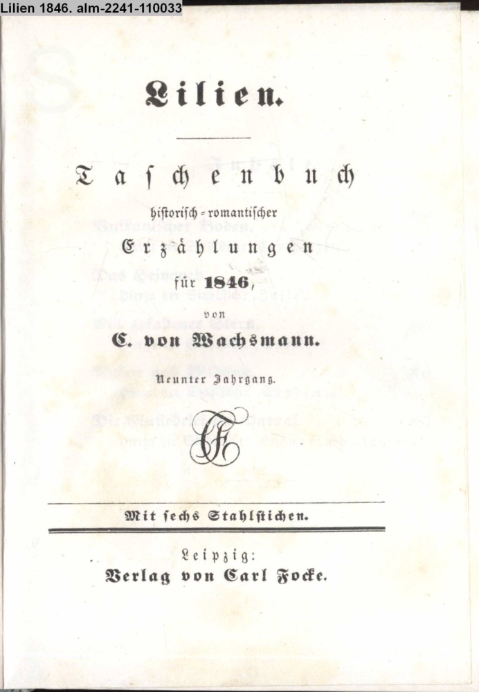 Lilien. / Taschenbuch / historisch-romantischer Erzählungen / für 1846, / von / C. von Wachsmann. / Neunter Jahrgang. / Mit sechs Stahlstichen. / Leipzig. / Verlag von Carl Focke