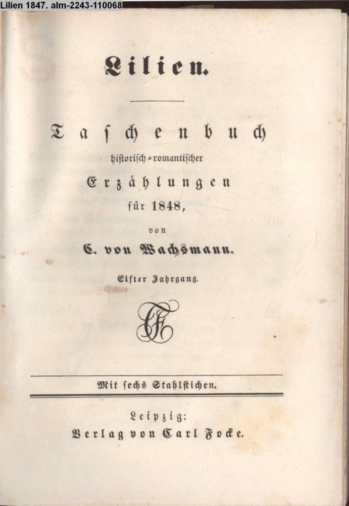 Lilien. / Taschenbuch / historisch-romantischer Erzählungen / für 1848, / von / C. von Wachsmann. / Elfter Jahrgang. / Mit sechs Stahlstichen. / Leipzig. / Verlag von Carl Focke