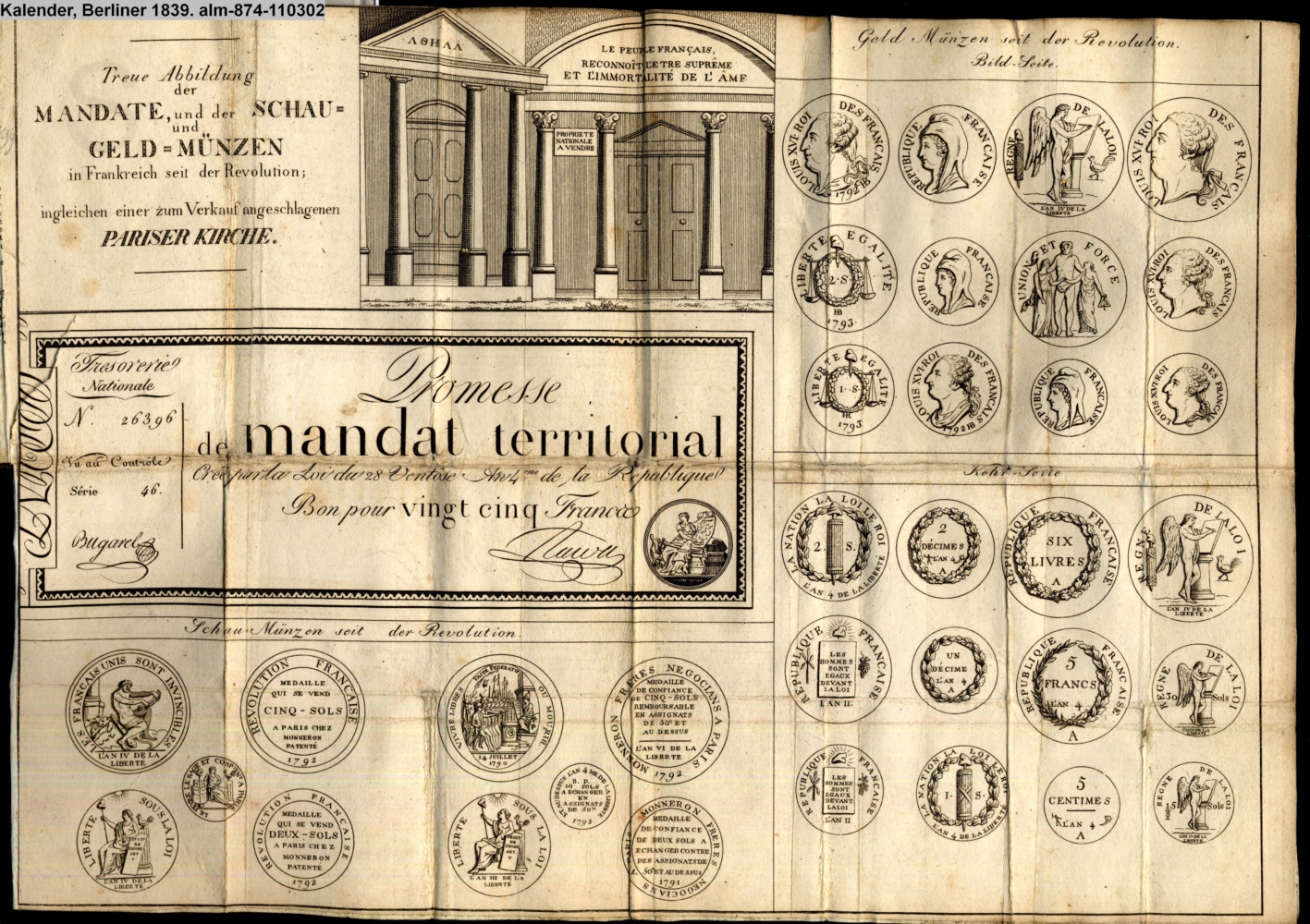 Treue Abbildung / der / MANNDATE un der SCHAU- / GELD-MÜNZEN / in Frankreich seit der Revolution; / ingelichen einer zum Verkauf angeschlagenen / PARISER KIRCHE