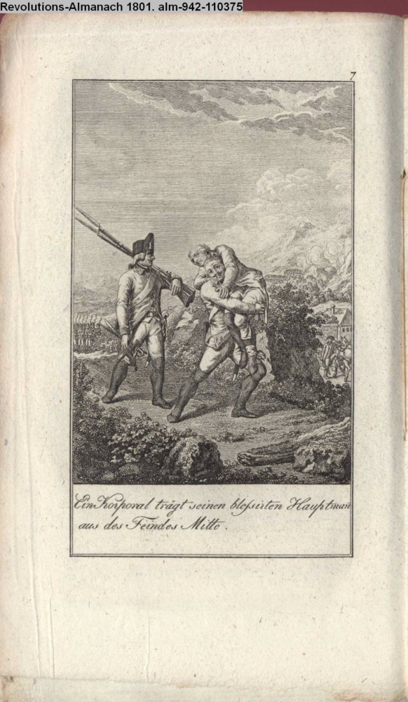 Ein Korporal trägt seinen blessirten Hauptmann / aus des Feindes Mitte