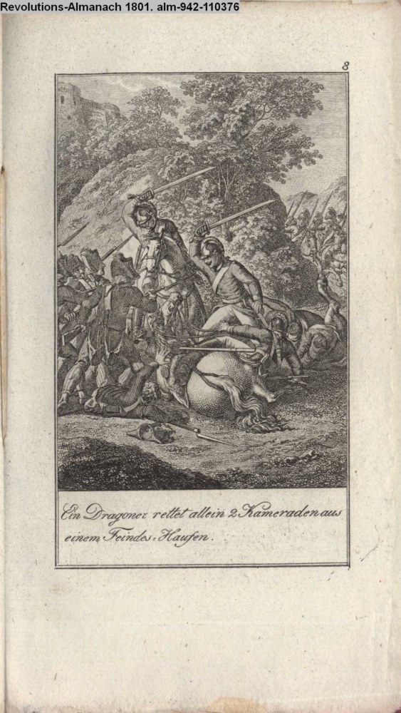 8. / Ein Dragoner rettet allein zwey Ka- / meraden aus einem Haufen Feinde