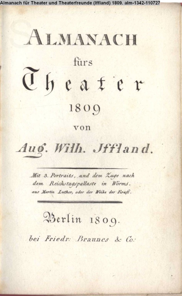 ALMANACH / fürs Theater / 1809 / von / Aug. Wilh. Iffland / mit 3 Portraits, und dem Zuge nach / dem Reichstagspallaste in Worms. / aus Martin Luther, oder der Weihe der Kraft. / Berlin 1809. / bei Friedr. Braunes & Co.