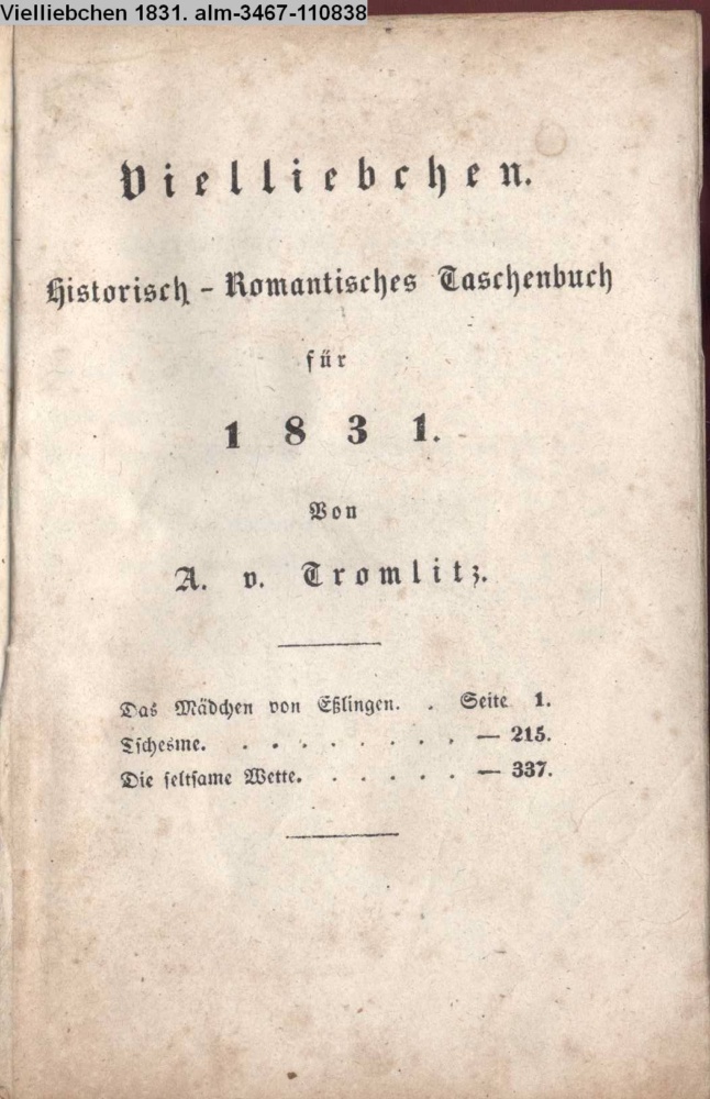 Vielliebchen. / Historisch-Romantisches Taschenbuch / für / 1831. / Von / A. v. Tromlitz