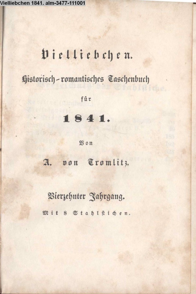 Vielliebchen. / Historisch-romantisches Taschenbuch / für / 1841. / Von / A. von Tromlitz. / Vierzehnter Jahrgang. / Mit 8 Stahlstichen