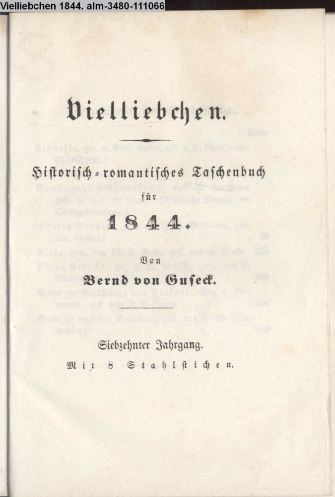 Vielliebchen. / Historisch-romantisches Taschenbuch / für / 1844. / Von / Bernd von Guseck. / Siebzehnter Jahrgang. / Mit 8 Stahlstichen