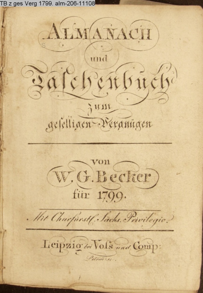 ALMANACH / und / Taschenbuch / zum / geselligen Vergnügen / von W. G. Becker / für 1799. / Mit Churfürstl. Sächs. Privilegio. / Leipzig bei Voss und Comp.