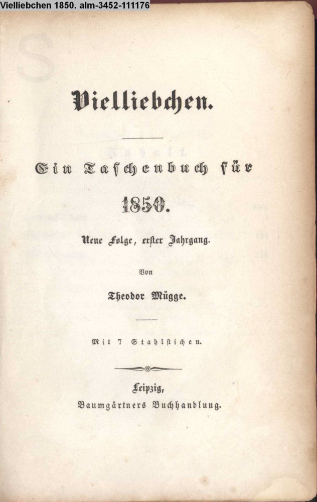 Vielliebchen. / Ein Taschenbuch / für / 1850. / Neue Folge, erster Jahrgang. / Von / Theodor Mügge. / Mit 7 Stahlstichen. / Leipzig, / Baumgärtners Buchhandlung