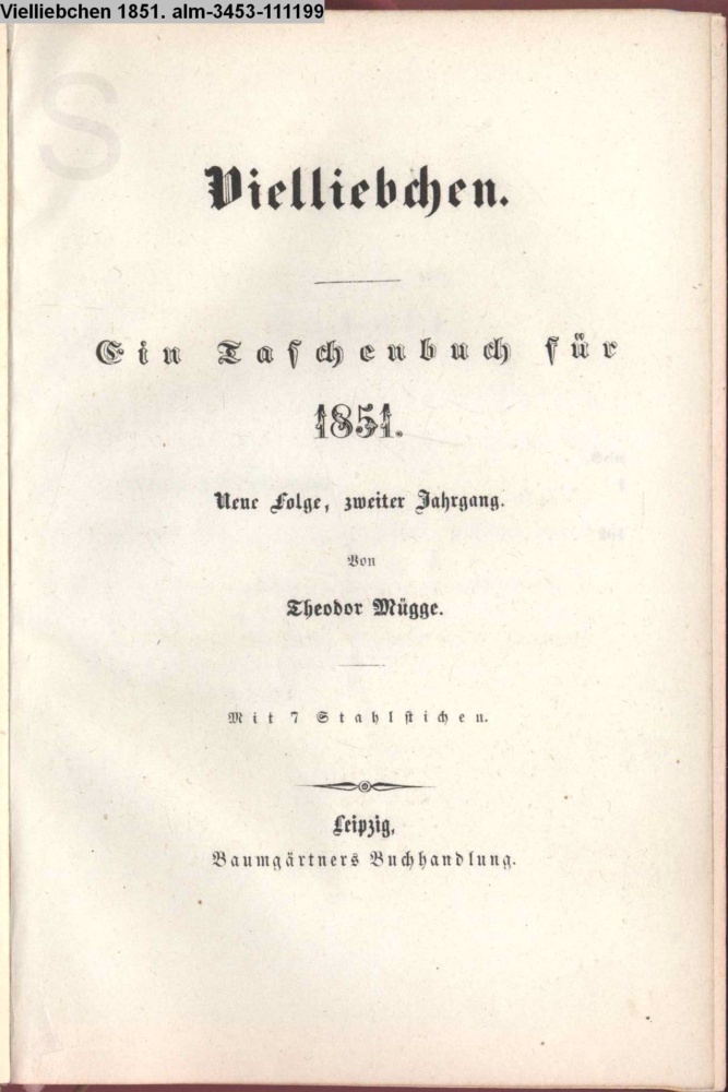 Vielliebchen. / Ein Taschenbuch für / 1851. / Neue Folge, zweiter Jahrgang. / Von / Theodor Mügge. / Mit 7 Stahlstichen. / Leipzig, / Baumgärtners Buchhandlung