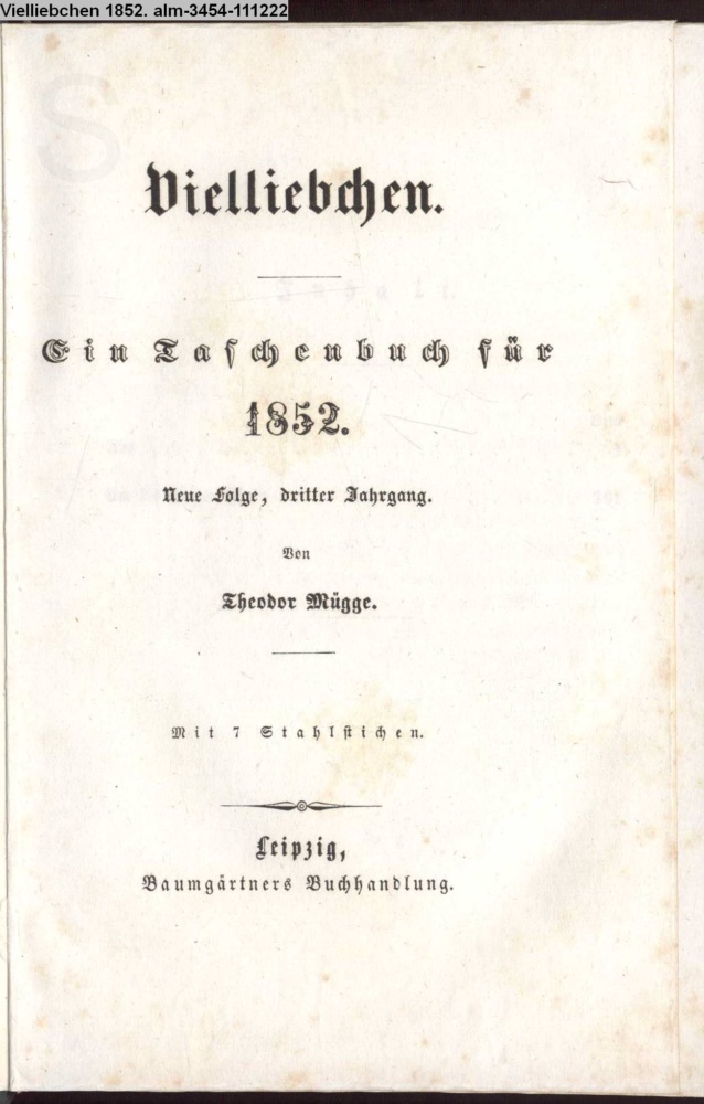 Vielliebchen. / Ein Taschenbuch für / 1852. / Neue Folge, dritter Jahrgang. / Von / Theodor Mügge. / Mit 7 Stahlstichen. / Leipzig, / Baumgärtners Buchhandlung