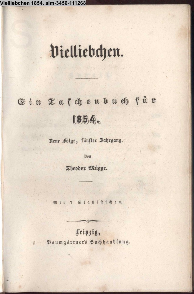 Vielliebchen. / Ein Taschenbuch für / 1854. / Neue Folge, fünfter Jahrgang. / Von / Theodor Mügge. / Mit 7 Stahlstichen. / Leipzig, / Baumgärtner's Buchhandlung