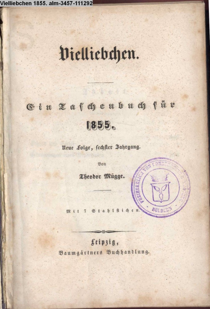 Vielliebchen. / Ein Taschenbuch für / 1855. / Neue Folge, sechster Jahrgang. / Von / Theodor Mügge. / Mit 7 Stahlstichen. / Leipzig, / Baumgärtners Buchhandlung