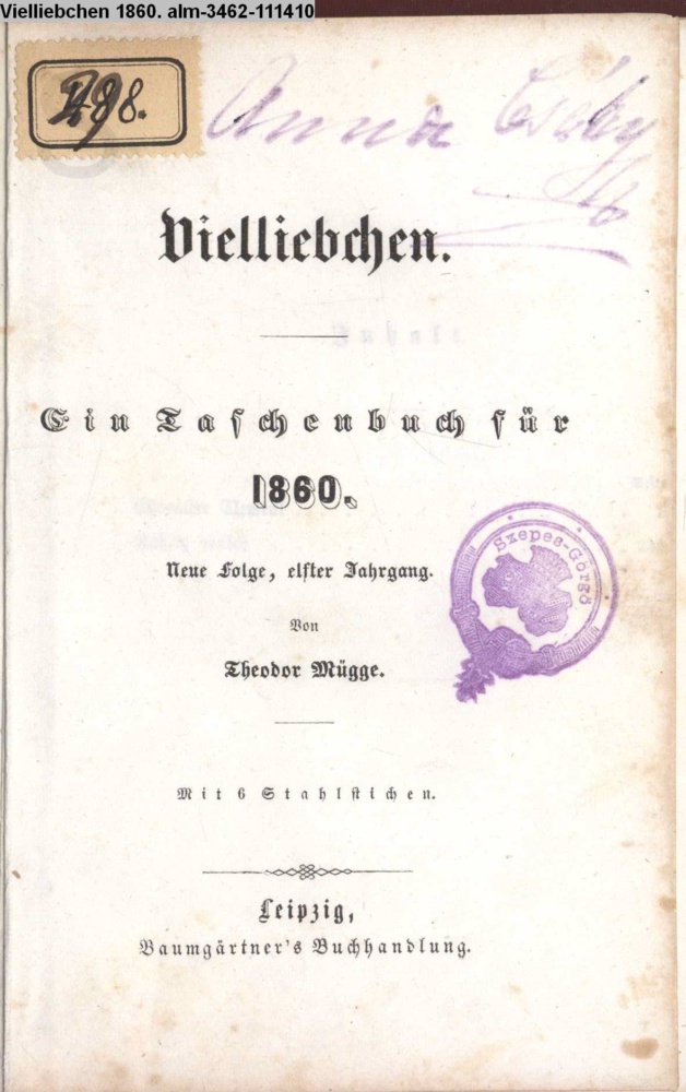 Vielliebchen. / Ein Taschenbuch für / 1860. / Neue Folge, elfter Jahrgang. / Von / Theodor Mügge. / Mit 6 Stahlstichen. / Leipzig, / Baumgärtner's Buchhandlung