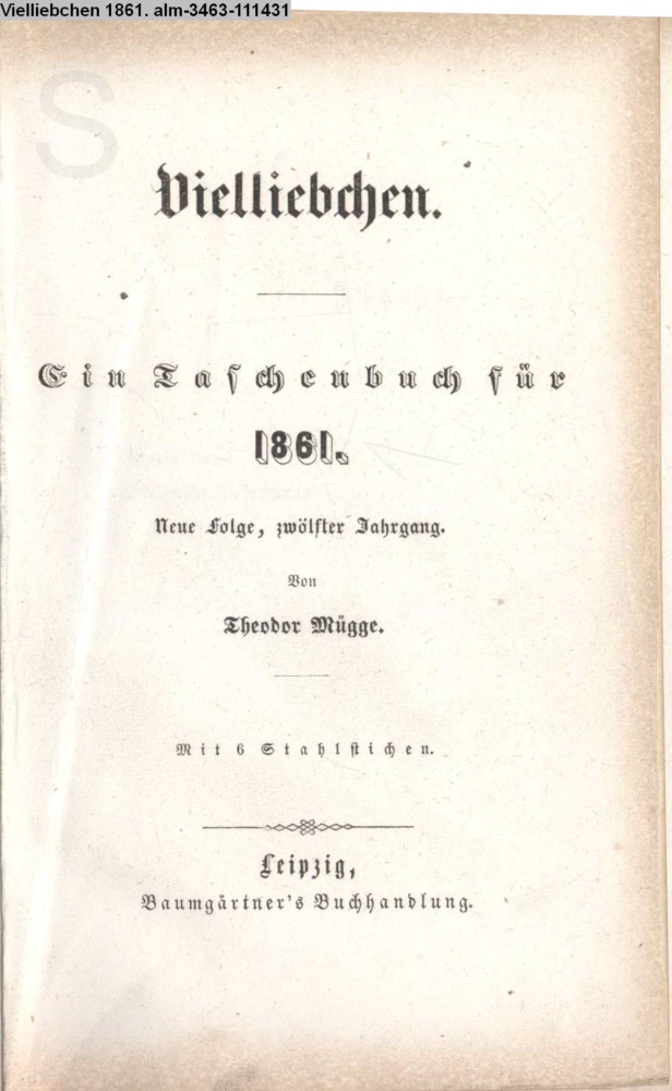 Vielliebchen. / Ein Taschenbuch für / 1861. / Neue Folge, zwölfter Jahrgang. / Von / Theodor Mügge. / Mit 6 Stahlstichen. / Leipzig, / Baumgärtner's Buchhandlung