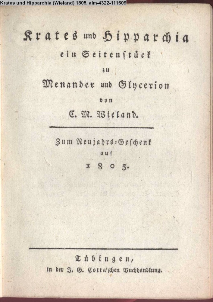 Krates und Hipparchia / ein Seitenstück / zu / Menander und Glycerion / von / C. M. Wieland. / Zum Neujahrs- Geschenk / auf / 1805. / Tübingen, / in der J. G. Cotta'schen Buchhandlung