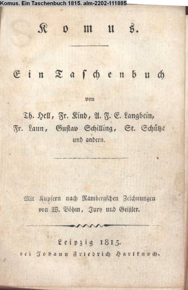 Komus. / Ein Taschenbuch / von / TH. Hell, Fr. Kind, A. F. E. Langbein, / Fr. Laun, Gustav Schilling, St. Schütze / und andern. / Mit Kupfern nach Rambergschen Zeichnungen / von W. Böhm, Jury und Geißler. / Leipzig 1815. / bei Johann Friedrich Hartknoch