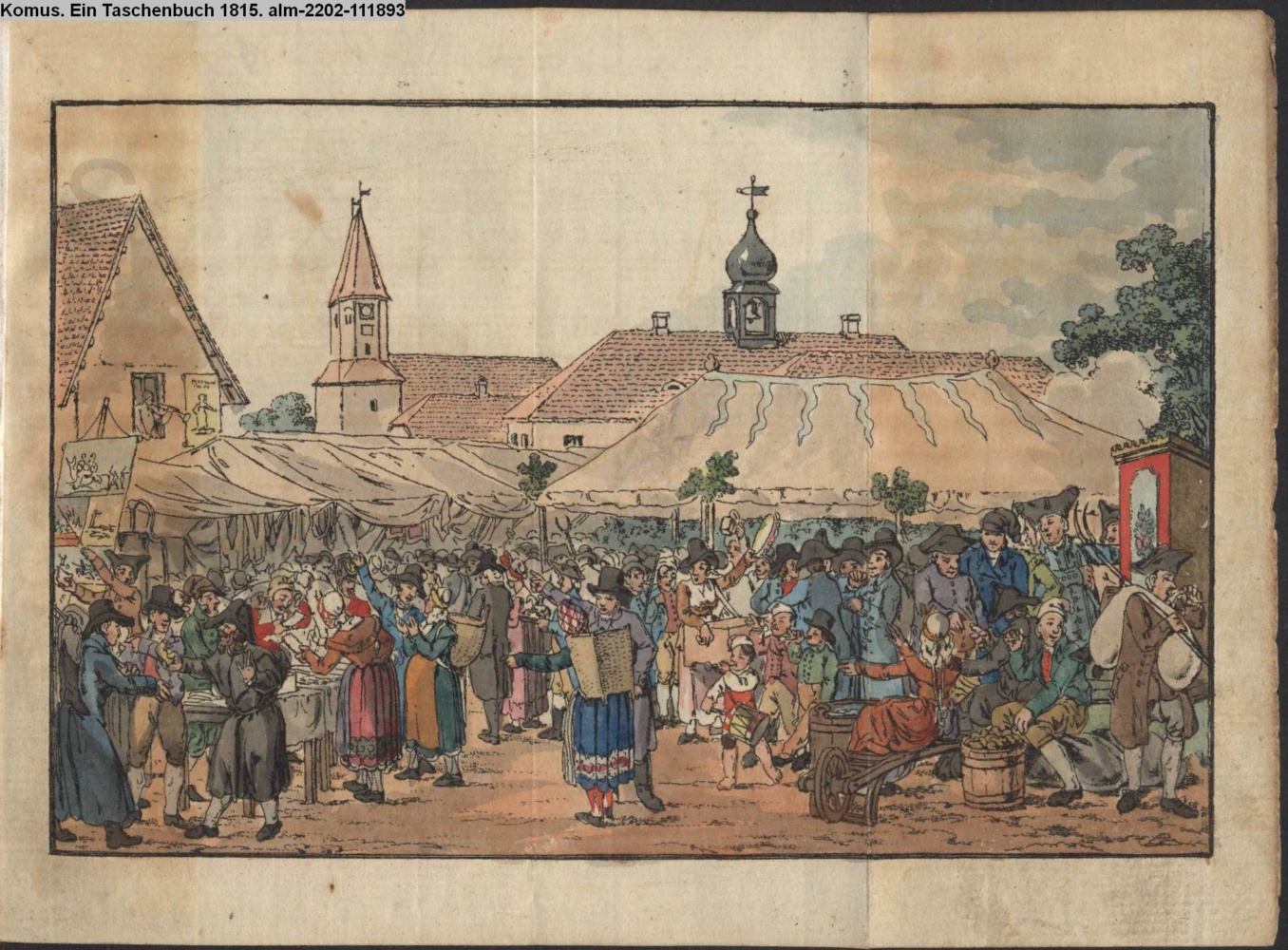 auszufaltende kol. Illustration zu »Der Jahrmarkt zu Knofelingen« von Fr. Kind