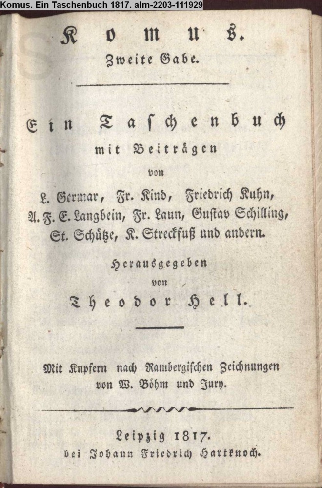 Komus. / Zweite Gabe. / Ein Taschenbuch / mit Beiträgen / von / L. Germar, Fr. Kind, Friedrich Kuhn, / A. F. E. Langbein, Fr. Laun, Gustav Schilling, / St. Schütze, K. Streckfuß und andern. / Herausgegeben / von / Theodor Hell. / Mit Kupfern nach Rambergischen Zeichnungen / von W. Böhm und Jury. / Leipzig 1817. / bei Johann Friedrich Hartknoch