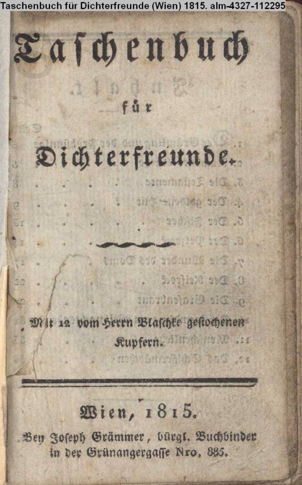 Taschenbuch / für / Dichterfreunde. / Mit 12 von Herrn Blaschke gestochenen / Kupfern. / Wien, 1815. / Bey Joseph Grämmer, bürgl. Buchbinder / in der Grünangergasse Nro. 885