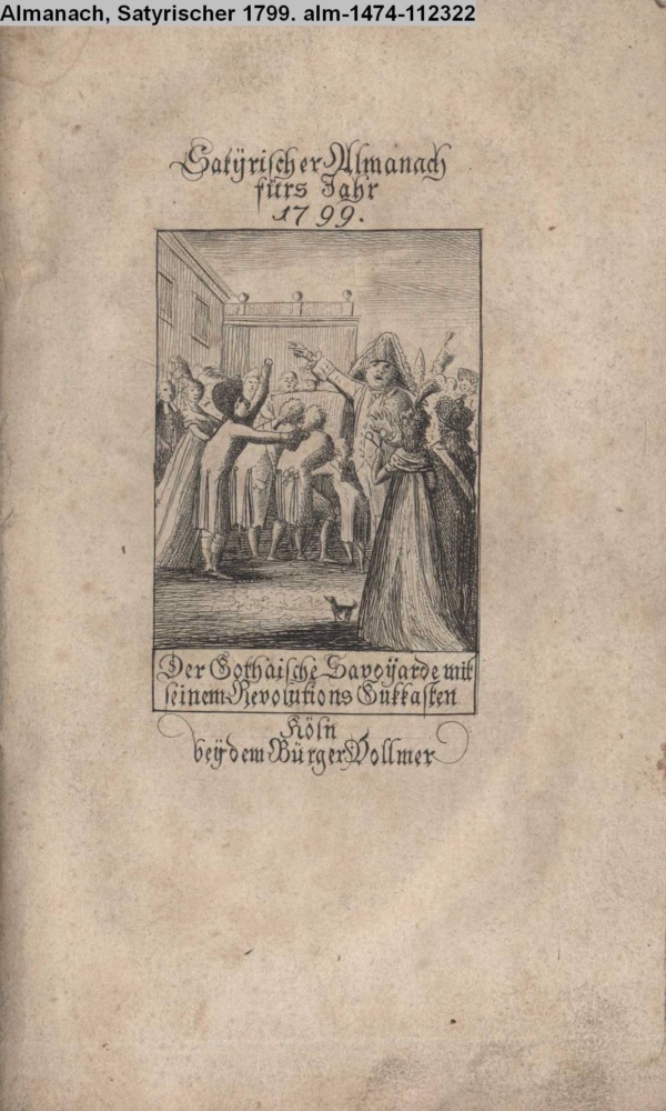 Satyrischer Allmanach / fürs Jahr / 1799. / Der Gothaische Savoyarde mit / seinem Revolutions Gukkasten / Köln / bey dem Bürger Vollmer
