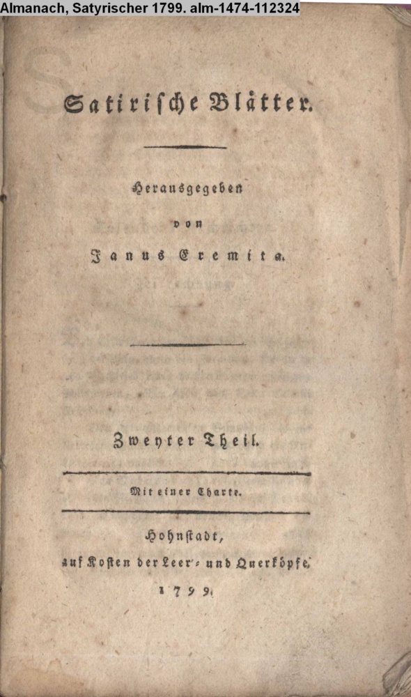 Satirischer / Almanach / Aufs Jahr 1799. / Herausgegeben / von / Janus Eremita / Mit einer Charte. / Hohnstadt, / auf Kosten der Leer- und Querköpfe. / 1799