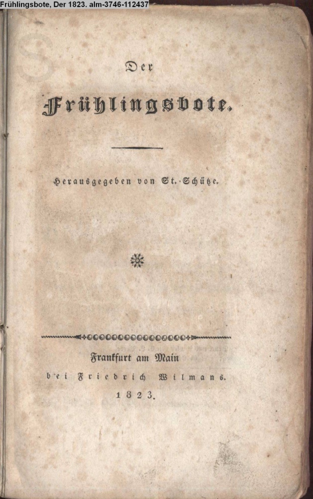 Der / Frühlingsbote. / Herausgegeben von St. Schütze. / Frankfurt am Main / bei Friedrich Wilmans. / 1823