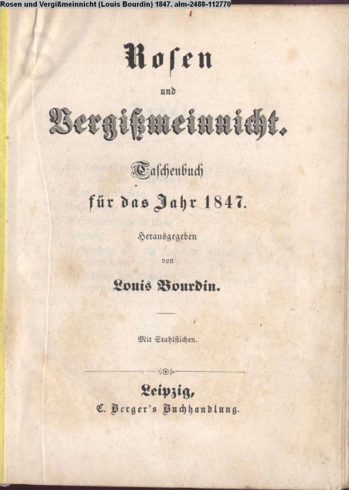 Rosen / und Vergißmeinnicht. / Taschenbuch / für das Jahr 1847. / Herausgegeben / von / Louis Bourdin. / Mit Stahlstichen. / Leipzig, / C. Berger's Buchhandlung