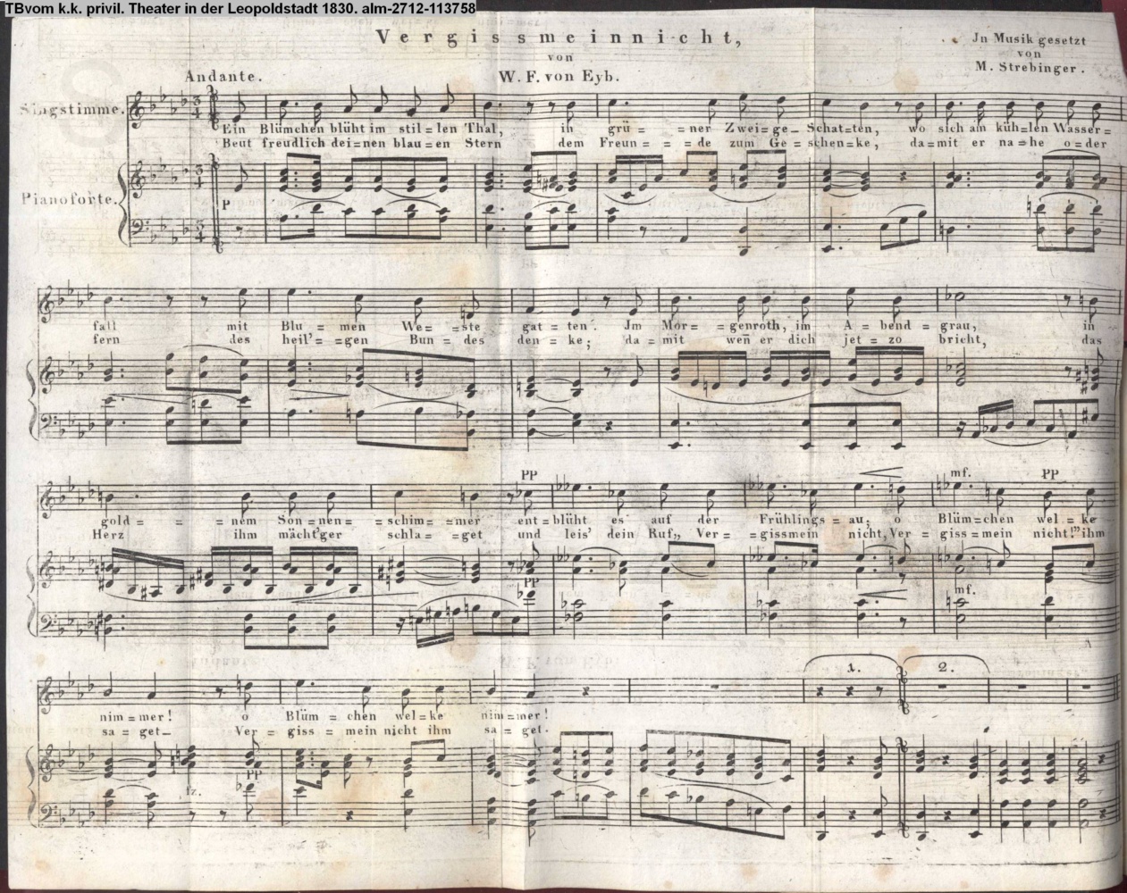 auszufaltende Vertonung des Gedichts »Vergißmeinnicht« von W. F. v. Eyb