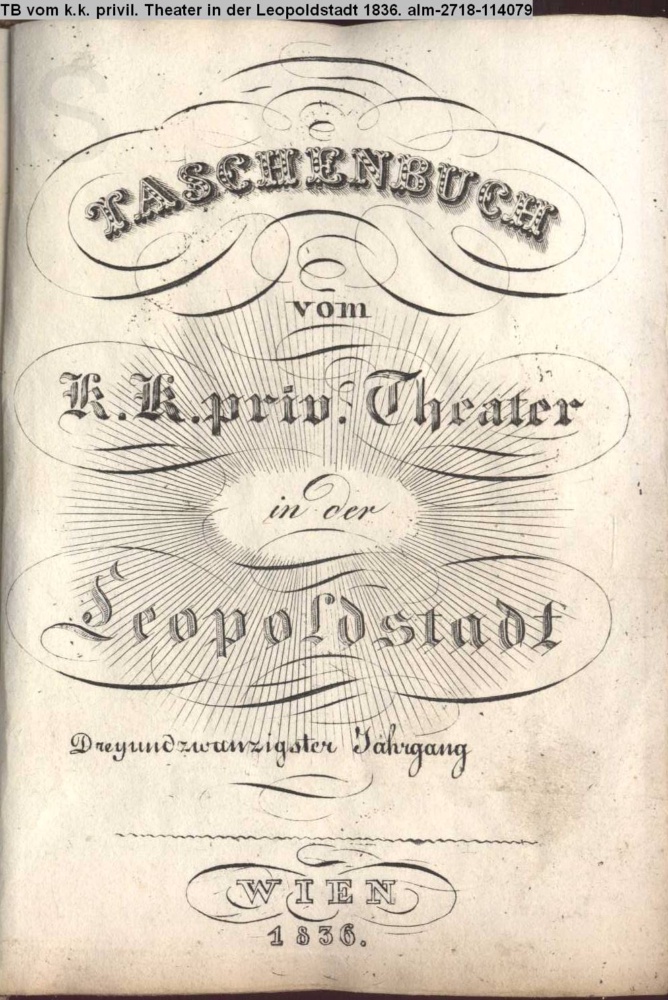 Taschenbuch / für das / k.k. privilegirte Theater / in der / Leopoldstadt, / auf das Jahr / 1836. / Zum Besten der Wittwe des Schau- / spielers Ziegelhauser. / Herausgegeben von / Carl Meisl / und / D. F. Reiberstorffer. / Wien, 1836 / Gedruckt in der Wollzeile, Nr. 782