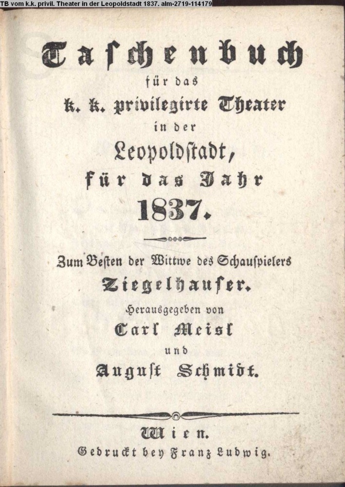 Taschenbuch / für das / k.k. privilegirte Theater / in der / Leopoldstadt, / auf das Jahr / 1837. / Zum Besten der Wittwe des Schauspielers / Ziegelhauser. / Herausgegeben von / Carl Meisl / August Schmidt. / Wien. / Gedruckt bey Franz Ludwig