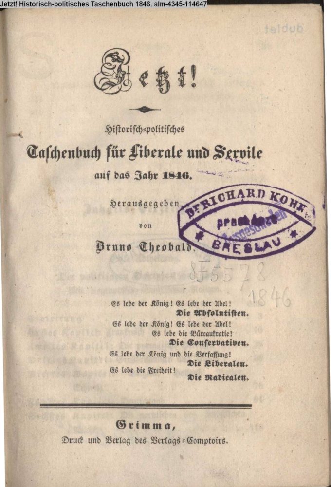 Jetzt! / Historisch-politisches / Taschenbuch für Liberale und Servile / auf das Jahr 1846. / Herausgegeben / von / Bruno Theobald. / Es lebe der König / Es lebe der Adel. / Die Absolutisten. / Es lebe der König! Es lebe der Adel! / Es lebe die Büreaukratie! / Die Conservativen. / Es lebe der König und die Verfassung! / Die Liberalen. / Es lebe die Freiheit! / Die Radicalen. / Grimma, / Druck und Verlag des Verlags-Comptoirs