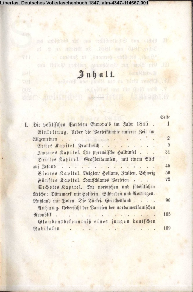 I. / Die politischen Parteien Europa's / im Jahre 1846. / Mit biographisch-literarischen Notizen, nebst Glaubensbekenntniß / eines jungen Radikalen