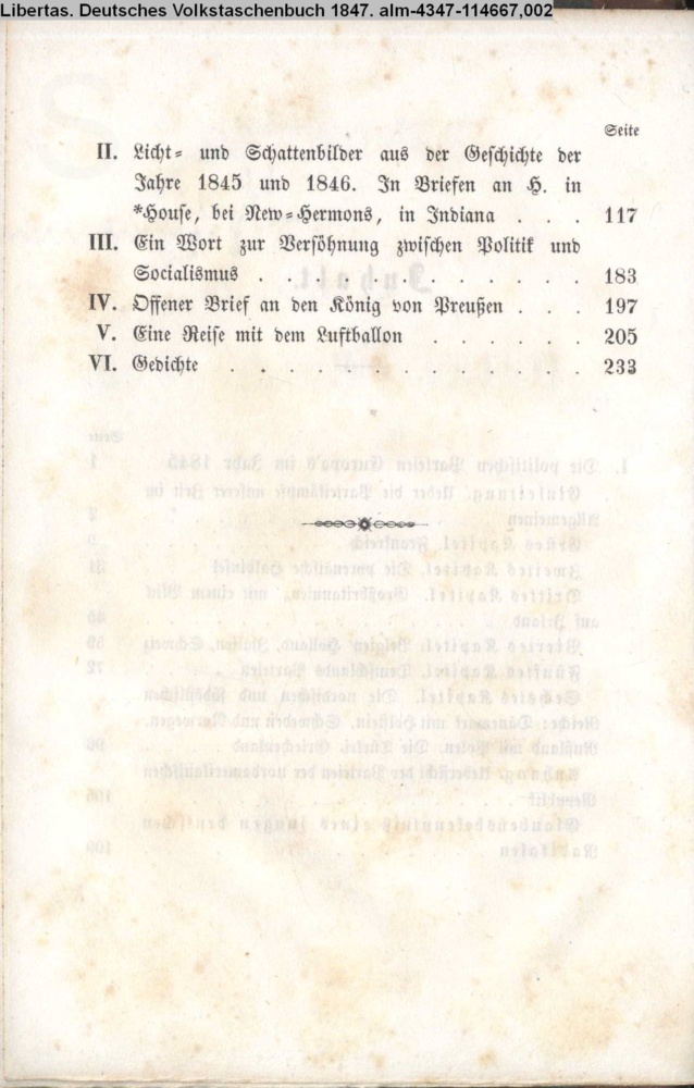 LIBERTAS. / Deutsches / Volks-Taschenbuch / auf das Jahr 1847. / Herausgegeben / von / T. Bruno. / Herisau. / Druck und Verlag des literarischen Instituts. / 1846