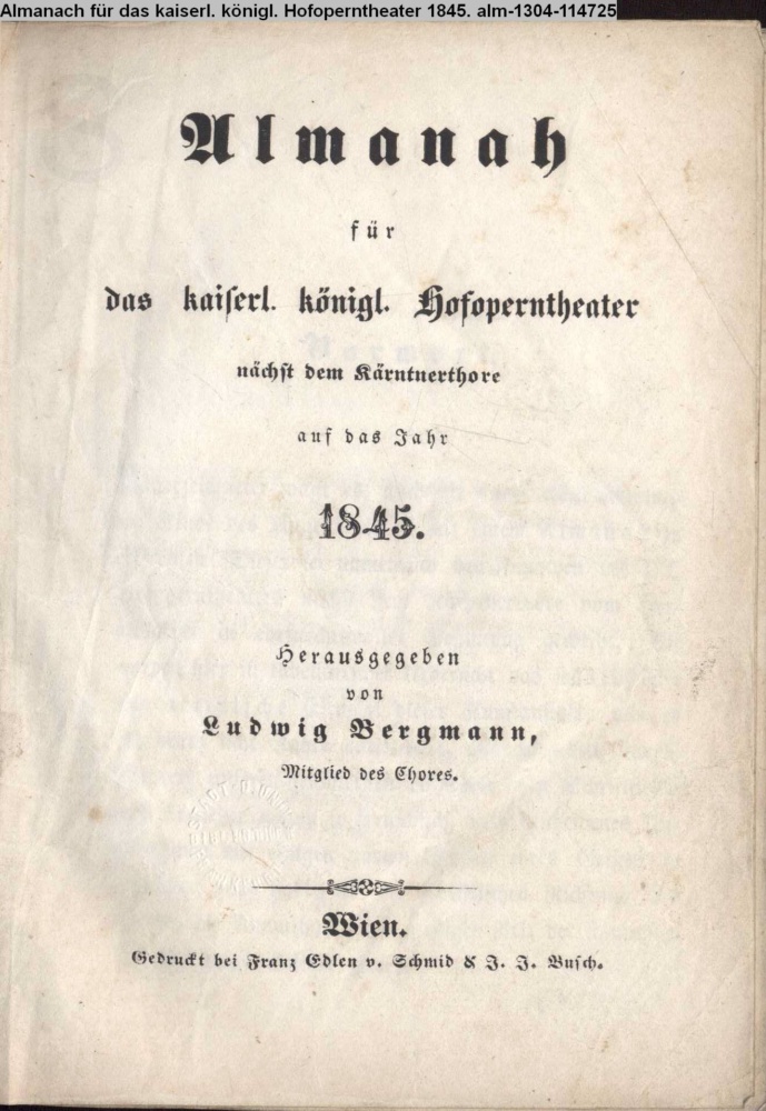 Almanah / für / das kaiserl. königl. Hofoperntheater / nächst dem Kärntnerthore / auf das Jahr / 1845. / Herausgegeben / von / Ludwig Bergmann, / Mitglied des Chores. / Wien. / Gedruckt bei Franz Edlen v. Schmid & J. J. Busch