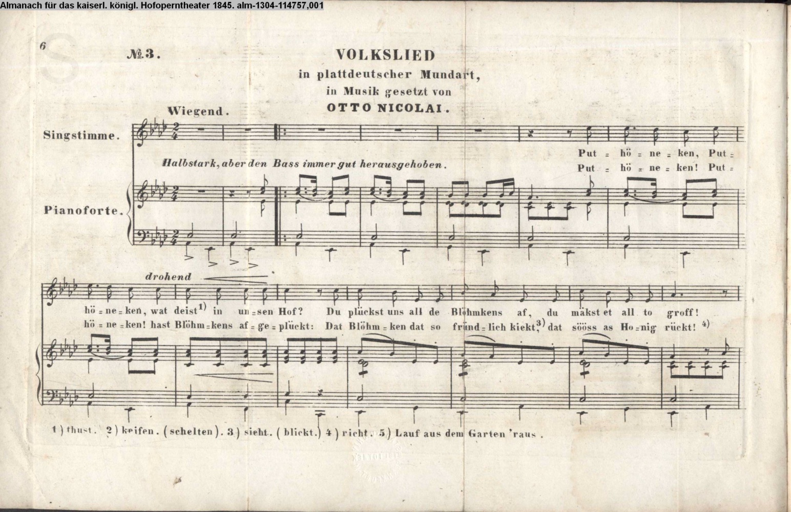 VOLKSLIED / in plattdeutscher Mundart, / in Musik gesetzt von / Otto Nicolai