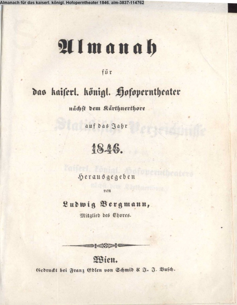 Almanach / für / das kaiserl. königl. Hofoperntheater / nächst dem Kärthnerthore / auf das Jahr / 1846. / Herausgegeben / von / Ludwig Bergmann, / Mitglied des Chores. / Wien. / Gedruckt bei Franz Edlen v. Schmid & J. J. Busch