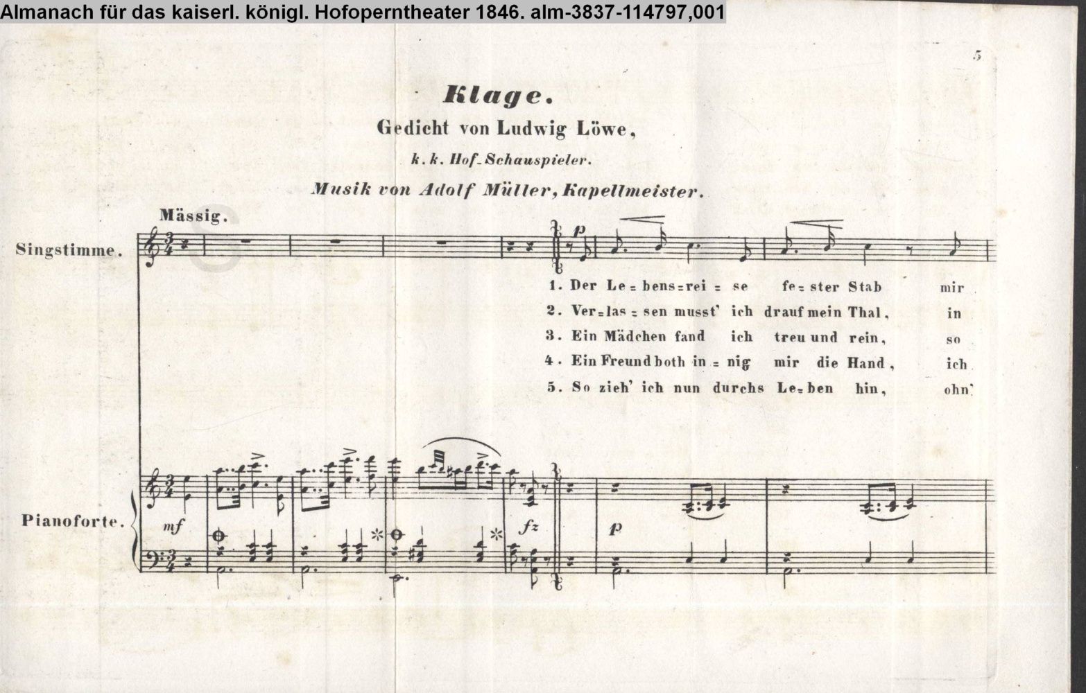 Klage. / Gedicht von Ludwig Löwe, / k.k. Hof- Schauspieler. / Musik von Adolf Müller, Hofkapellmeister