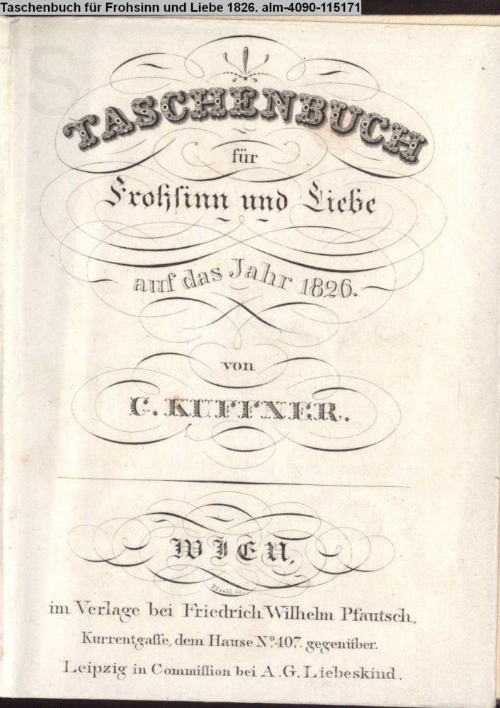 TASCHENBUCH / für / Frohsinn und Liebe / auf das Jahr 1826. / Von / C. KUFFNER. / WIEN, / im Verlage bei Friedrich Wilhelm Pfautsch, / Kurrentgasse, dem Hause No. 407 gegenüber. / Leipzig, in Commission bei A. G. Liebeskind