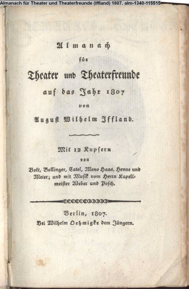 Almanach / für / Theater und Theaterfreunde / auf das Jahr 1807 / von / August Wilhelm Iffland. / Mit 12 Kupfern / von / Bolt, Bollinger, Catel, Meno Haas, Henne und / Meier; und mit Musik vom Herrn Kapell- / meister Weber und Posch. / Berlin, 1807. / Bei Wilhelm Oehmigke dem Jüngern