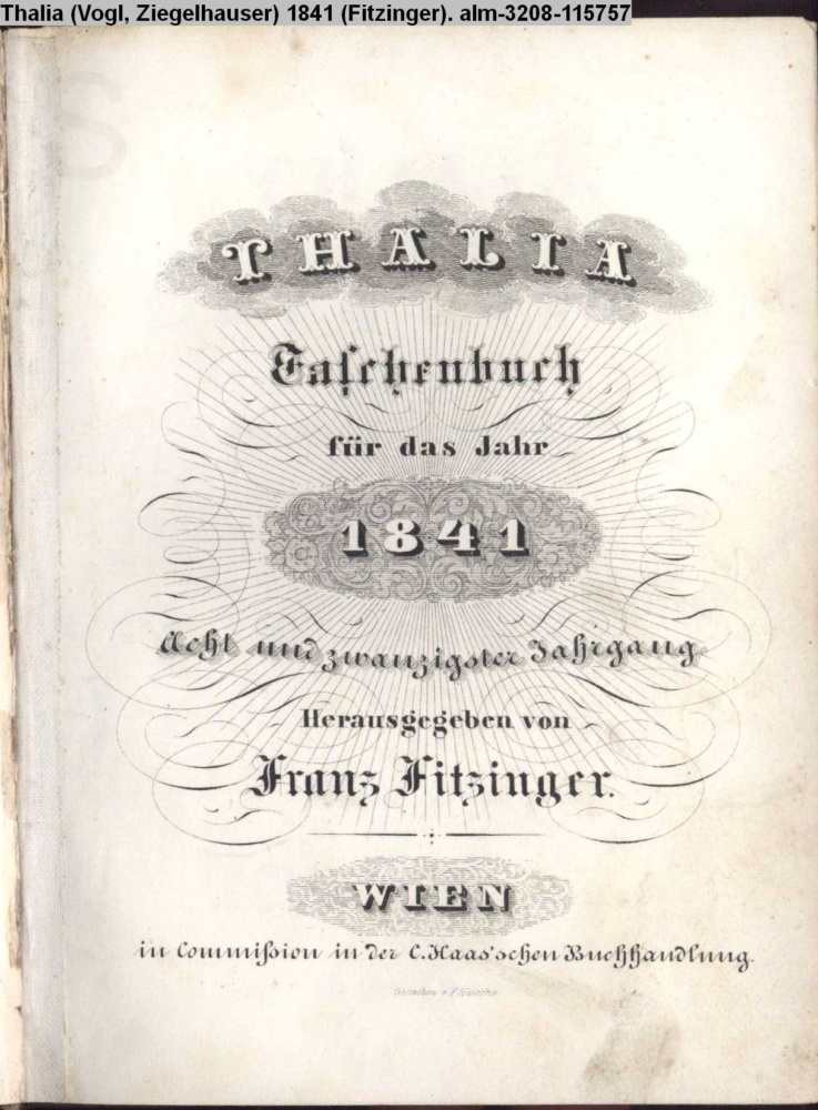 THALIA. / Taschenbuch / für das k.k. priv. / Theater in der Leopoldstadt / auf das Jahr 1841. / Zum Besten der Witwe des Schauspielers / Ziegelhauser. / Herausgegeben / von / Franz Fitzinger. / Wien. / Gedruckt bei Anton Strauß's sel. Witwe