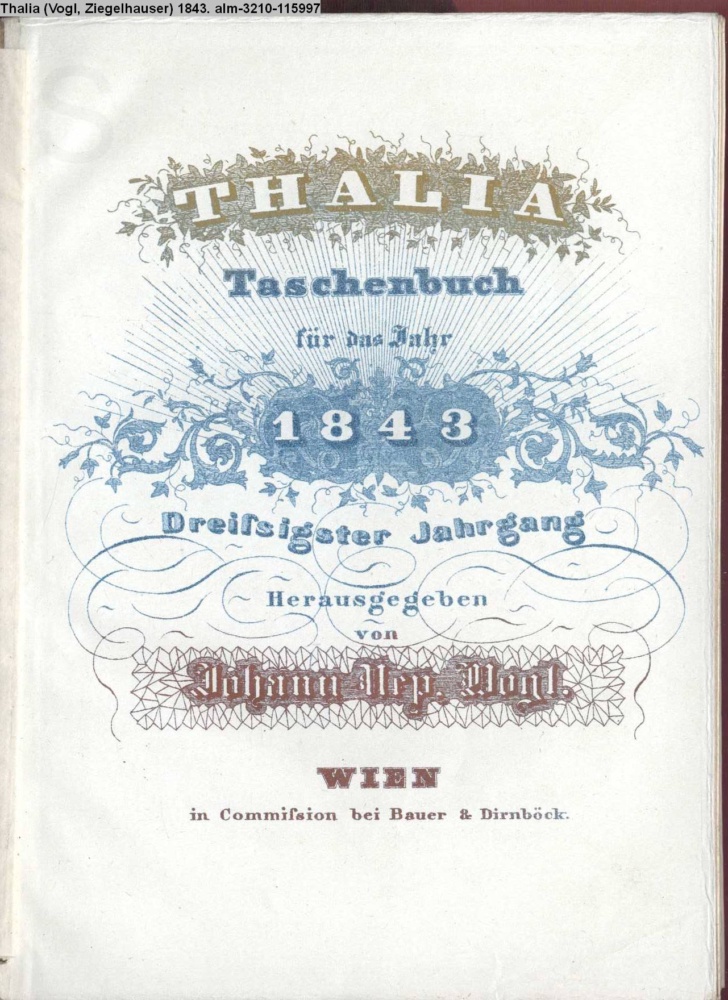 THALIA. / Taschenbuch / auf das Jahr / 1843 / Herausgegeben / von / Joh. Nep. Vogl. / WIEN / in Commission bei Bauer und Dirnböck