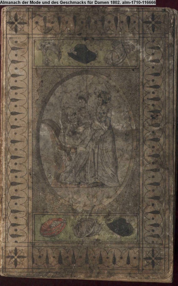 Almanach / der / Mode und des Geschmacks / für Damen, / Auf das Jahr 1802. / Zur / Kunde eleganter Gegenstände, und zur Be- / urtheilung des Schönen in der Tanzkunst, / Schauspielkunst, Musik, Zeichenkunst, Ma- / lerei, Stickerei u.s.w. / Mit V Kupfern. / Berlin, 1802, / bei Oehmigke dem Jüngern. / (Preis 1 Thl 16 Gr., m. illum. Kupf. 2. Thl. 8 Gr.)