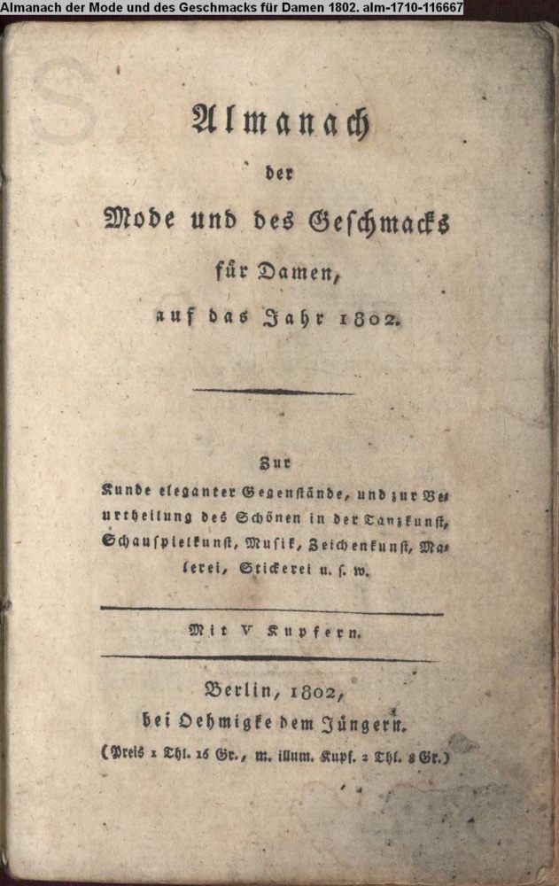 Almanach / der / Mode und des Geschmacks / für Damen, / Auf das Jahr 1802. / Zur / Kunde eleganter Gegenstände, und zur Be- / urtheilung des Schönen in der Tanzkunst, / Schauspielkunst, Musik, Zeichenkunst, Ma- / lerei, Stickerei u.s.w. / Mit V Kupfern. / Berlin, 1802, / bei Oehmigke dem Jüngern. / (Preis 1 Thl 16 Gr., m. illum. Kupf. 2. Thl. 8 Gr.)