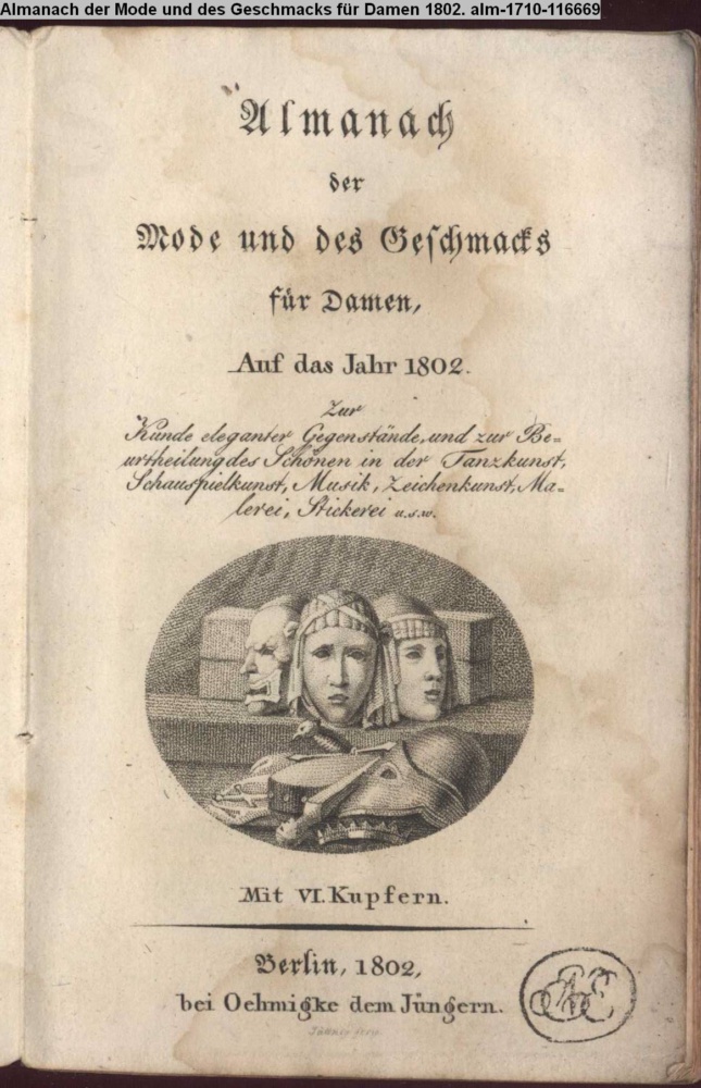 Almanach / der / Mode und des Geschmacks / für Damen, / Auf das Jahr 1802. / Zur / Kunde eleganter Gegenstände, und zur Be- / urtheilung des Schönen in der Tanzkunst, / Schauspielkunst, Musik, Zeichenkunst, Ma- / lerei, Stickerei u.s.w. / Mit VI Kupfern. / Berlin, 1802, / bei Oehmigke dem Jüngern