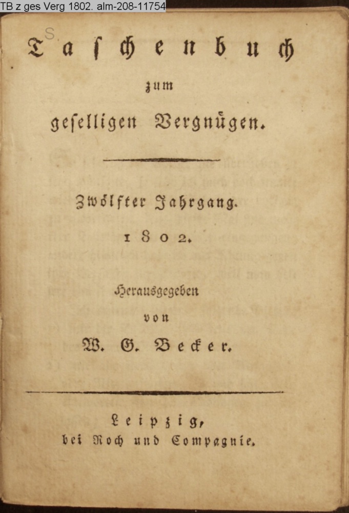 Taschenbuch / zum / geselligen Vergnügen. / Zwölfter Jahrgang. / 1802. / Herausgegeben / von / W. G. Becker. / Leipzig, / bei Roch und Compagnie
