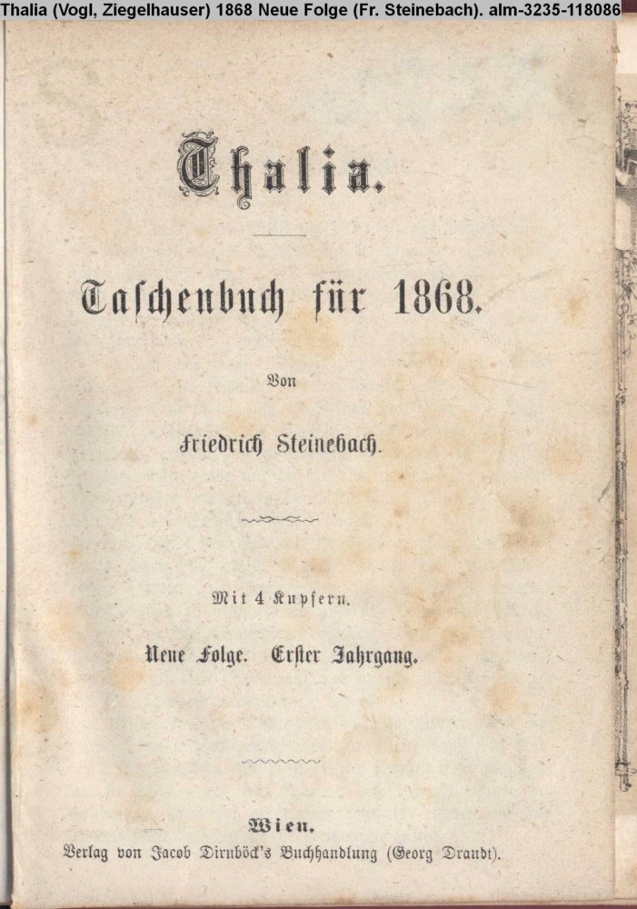 Thalia. / Taschenbuch / für 1868. / Von / Friedrich Steinebach. / Mit 4 Kupfern. / Neue Folge. Erster Jahrgang. / Wien. / Verlag von Jacob Dirnböck's Buchhandlung (Georg Draudt.)